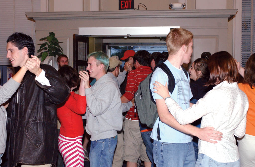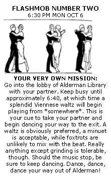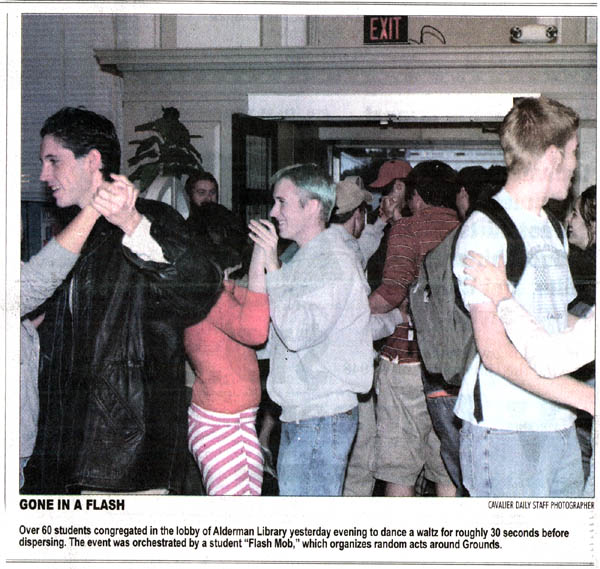 Flashmob #2 At 6:40 PM on Monday, October 6th, Alderman Library was a peaceful place. Students, standing around, talking, reading, doing those things that kids at libraries do. Did I mention waltzing? Yes, there was waltzing, too. Ten minutes earlier the masses as uninformedly gathered between Clemons and Alderman, their greedy little fists filled with this flyer. While the expected turnout was "something more than 15," well over 50 (and somewhere below 70, i suppose) mobbers showed up, not aware that they were wearing their dancin' shoes. We filtered in, unnoticed, probably doubling the number of people that were already in the library. When the sweet sounds of a Viennese waltz began to flood Alderman library, a gentle hestitation shook the crowd, quickly followed by an eruption of partnered ballroom dancing of Pompeiic proportions. I'd say it was amazing, but "glorious" seems to be the adjective du jour (du mobbe?). Here's what some people had to say: "I came, I saw, I waltzed. It was a glorious thing." "it was cleverly planned, flawlessly executed, and undeniably awesome. I'm saving it as a story to someday swell the hearts of my grandchildren." "i was there -Emails from various mobbers If anyone heard anything from spectators, I'd love it if you'd mail me so I can put up some stuff on here. Also, if you have any pictures, send 'em to me! Coverage: