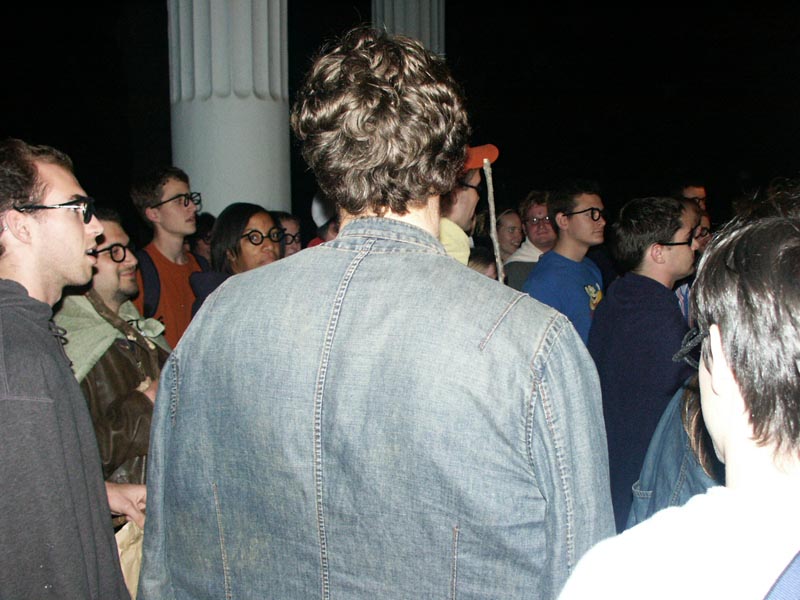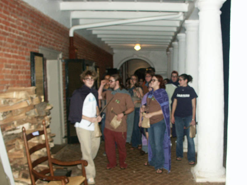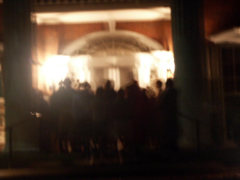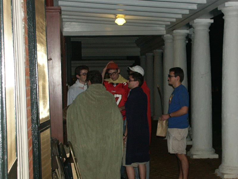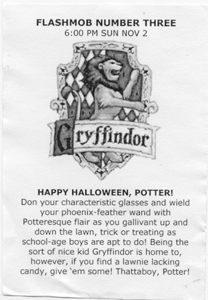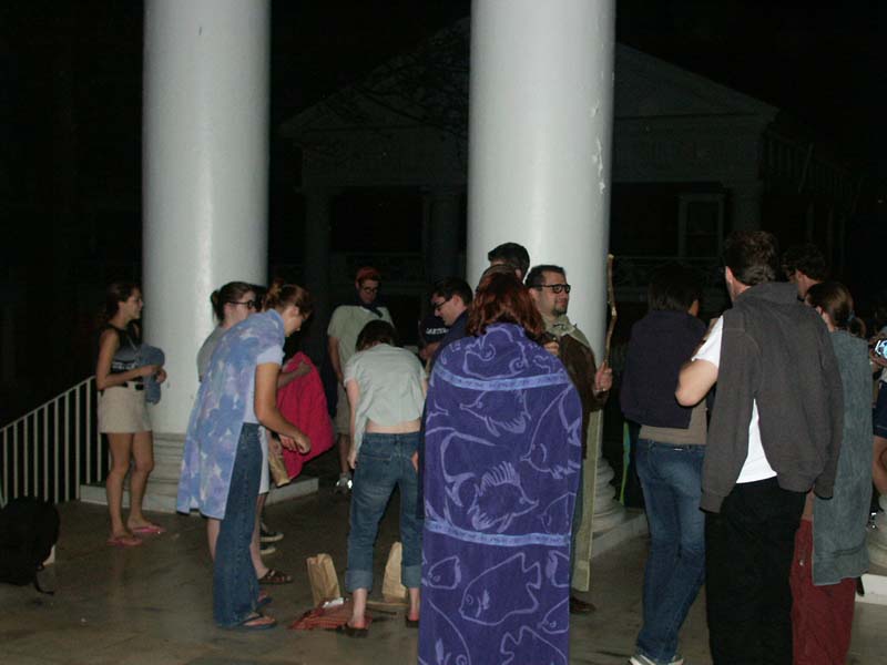 Flashmob #3 Halloween brought it's share of ghosts, Spidermans and one rather striking Larry J. Sabato. But Harry Potter? Sure, Potter was alive and well, but not nearly with the incredible force he had possessed in recent years. J.K. Rowling certainly deserved better. And so we had to give it to her. The day was November 2nd, UVa's Lawn having already been looted and pillaged by the hordes of children it bore witness to each October 31st. The time was 6:00PM, the last rays of the sun dying out over the steps of the Rotunda. These last rays were enough to illuminate what the Rotunda helds in its Jeffersonian little belly, though. Potters. Harry Potters. Forty of them. After being presented with instructions, glasses, a wand, and a bag with some candy, the Potters donned towel capes and split into groups, roaming like packs of adolescent magical wolves. We descended upon the lawn with vigor, squeezing the last drops of candy from the unwilling Lawnies, showing the Muggles in Jefferson's hallowed households that Halloween wasn't quite over yet. But it didn't stop there. John T. Casteen III, President of the University, was probably feeling lonely. He was probably wishing that Halloween had never ended, that something would happen that would bring back the magic and light that spark in his eyes. Being the charitable Gryffindorians we are, we fled the Lawn and soon found ourselves at his presidential doorstep. Also, he found us there, which was probably a little more shocking than us finding us there. Being the prince that he is, Casteen rummaged through his house for candy, giving us all that was left in his house. With that, we turned walkingly down his sidewalk, until the crucial moment of "Disperse!" and then we each found ourselves each alone, each a single fleeing wizard, enchanted with the lingering spell of the flashmob. Pictures: